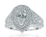 Art deco design diamond engagement ring showcases a 0.78 carat pear cut natural diamond center surrounded by a double halo of glittering colorless round cut diamonds in micro pave setting. Additional diamonds line the three row split shank with graduated diamonds adding an extra beauty to the design. Handcrafted of 14-karat white gold and completed with a high polish finish. It's a perfect way to say- I Love You - with this gorgeous diamond ring. The total carat weight is 1.59 carats.