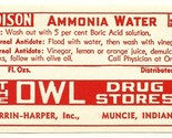 Antique Pharmacy Label AMMONIA WATER Owl Drug Stores Muncie IN |