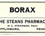 1 Antique Pharmacy Label BORAX Steans Pharmacy Mifflinburg, M.L. Steadman Prop.