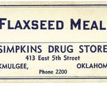 Antique Pharmacy Label FLAXSEED MEAL Simkins Drug Store Okmulgee |