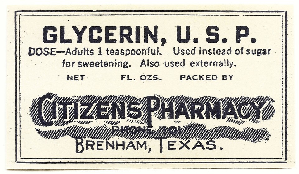 - 1 Antique Pharmacy Label GLYCERIN, U.S.P. Citizens Pharmacy Brenham Texas