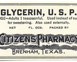Antique Pharmacy Label GLYCERIN, U.S.P. Citizens Pharmacy Brenham |