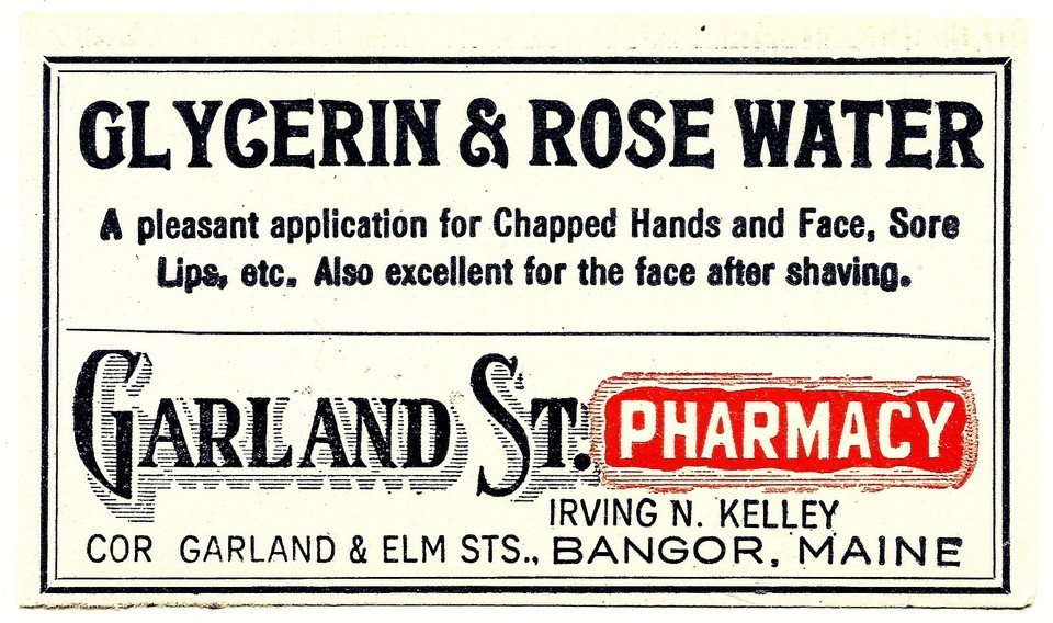Pharmacy Label GLYCERIN & ROSE WATER Garland St. Pharmacy Bangor |