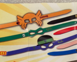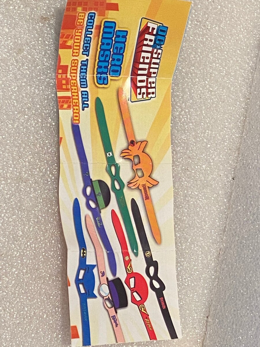 It says the DC character's name on the mask strip and their mask or hat on the front.