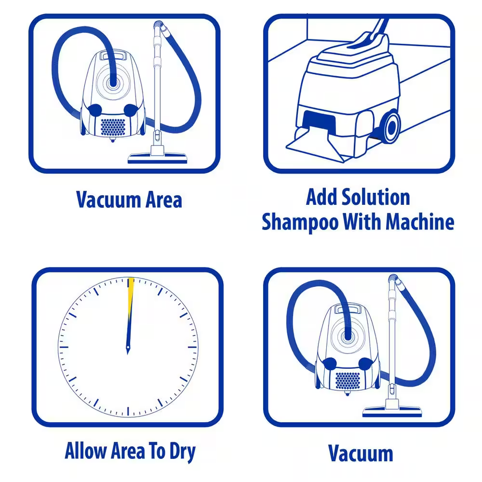 Carpet shampoo removes, dirt, stains and odor leaving fresh scent