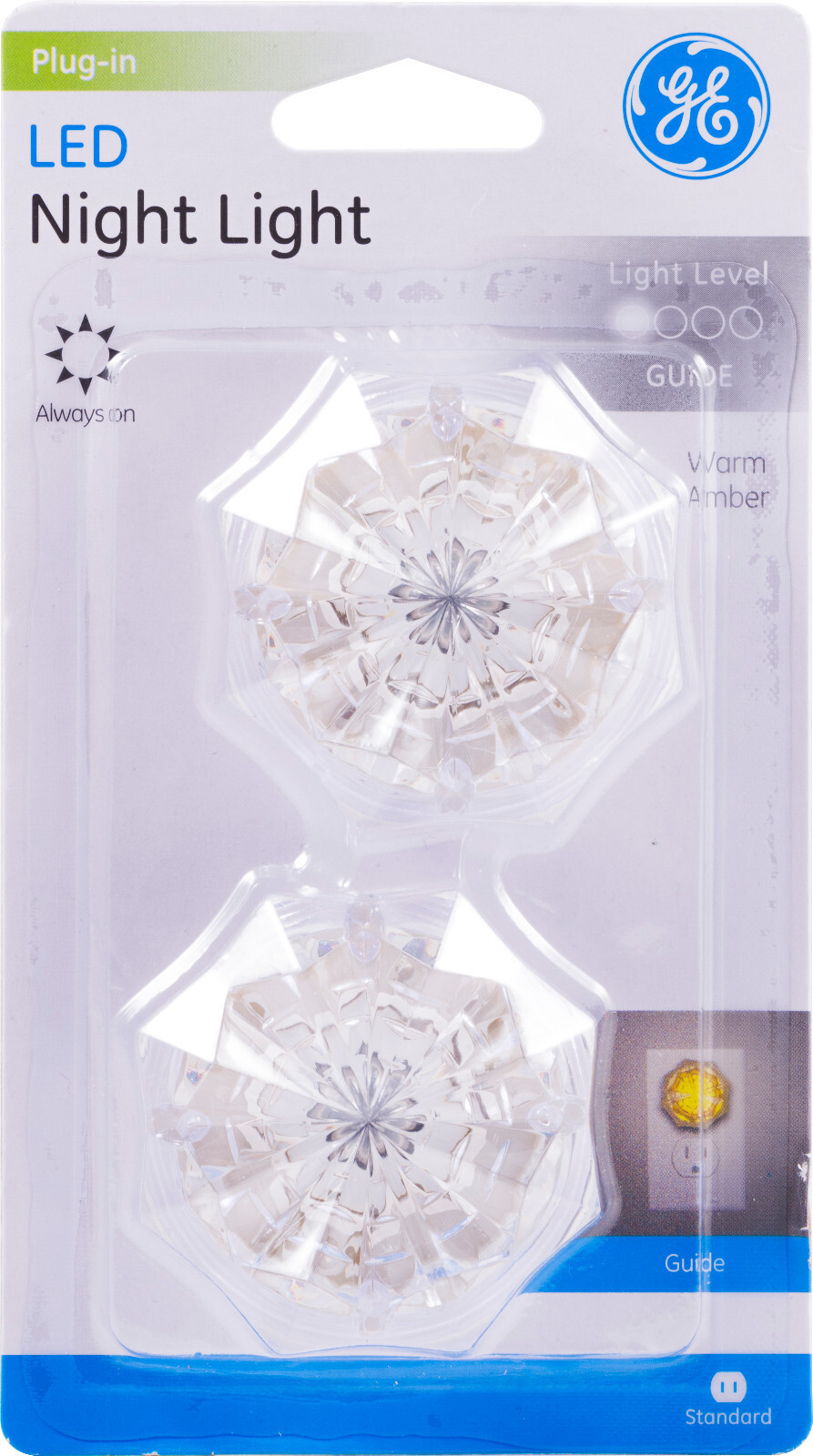 FOR SALE IS ONE (1) NEW GENERAL ELECTRIC LED JEWEL WITH TWO PRONG (two blade) GROUNDED PLUG IN NIGHT LIGHT BY GE BRAND MPN 11291 UPC# 043180112910. NO FACTORY PACKAGING, SINCE I BUY THESE IN BULK. THIS IS A CONSTANT ON (amber orange mellow glow) NIGHT LIGHT WITH NO SENSOR, NO SWITCH, JUST ALWAYS ON. SAFE DESIGN IS UL CLASSIFIED AND FEATURES ELEGANT JEWEL CRYSTAL CLASSIC AMBER color VINTAGE DESIGN NIGHT LIGHT WITH ENERGY EFFICIENT, ALWAYS ON, AMBER GLOW LED LIGHT, SAVE ENERGY AND SAVE MONEY WITH THIS TWO BLADE (2 prong grounded = 1 prong wider 1 prong slimmer) PLUG IN LED NIGHT LIGHT, SAFE AND MAINTENANCE FREE, COOL TO THE TOUCH, LASTS FOR YEARS. ALWAYS ON, LONG LIFE LED WITH NO BULBS TO REPLACE, ENERGY EFFICIENT USING ONLY 1/2 watt OF ELECTRICITY (0.5W max), DELIVERS A WARM AMBER GLOW, COOL TO THE TOUCH, UL LISTED, SAFE AROUND CHILDREN. JUST PLUG IT INTO ANY AC OUTLET WITH TWO OR THREE BLADES, GREAT FOR BEDROOM, BATHROOM, HALLWAY, USE ON YOUR POWER STRIP TO CONFIRM AC POWER, ETC. YOU WILL RECEIVE ONE (1) GE LED JEWEL NIGHTLIGHT SHIPPED BY USPS.....