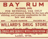- 1 Vintage Pharmacy Label BAY RUM Alcohol 58% Willard's Drug Store Lusk Wyoming