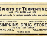1 Vintage Pharmacy Label SPIRITS OF TURPENTINE Simpkins Drug Store Okmulgee OK
