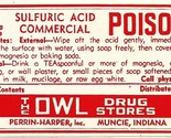 1 Vintage Pharmacy Label SULFURIC ACID POISON The Owl Drug Stores Muncie Indiana