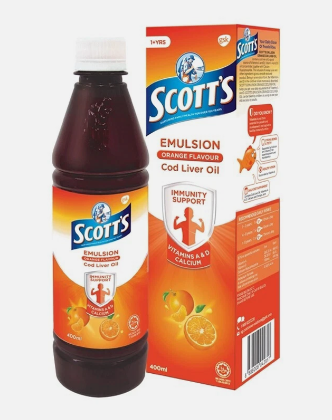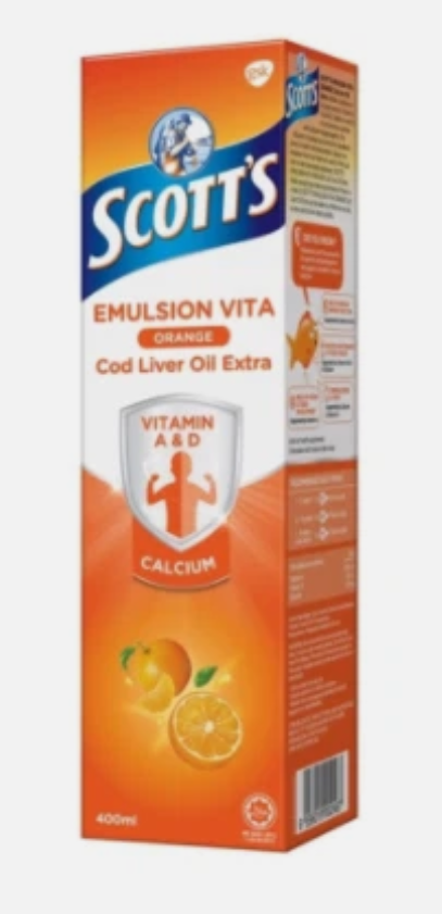 - 1 X 400ml Scott's Emulsion Cod Liver Oil Orange Flavour Vitamin A & D