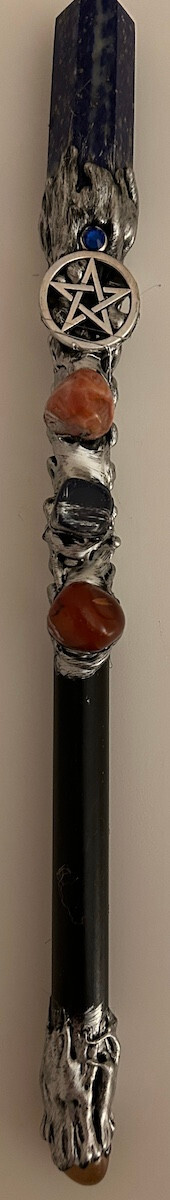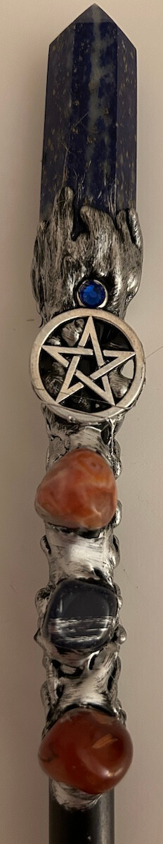 A perfect tool for protection work, this wand featuring a lapis lazuli point and pentacle talisman will assist the user in marking out