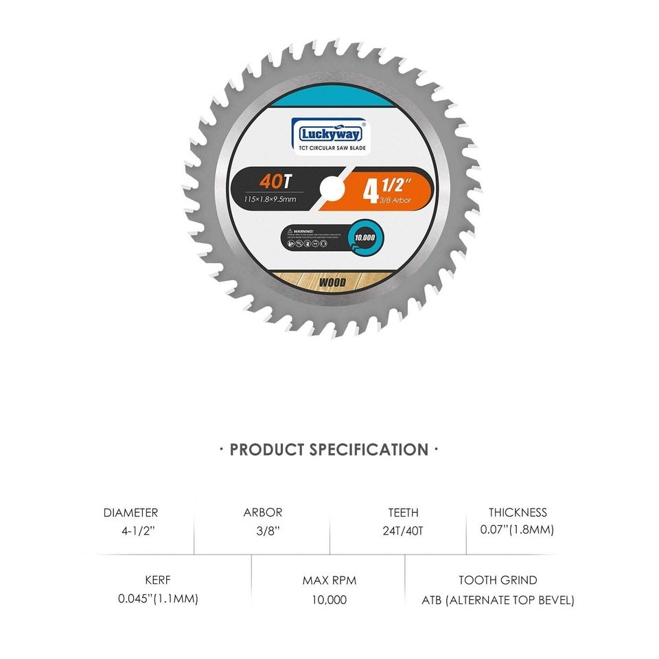 Includes 10 pieces of 4-1/2" diameter, 3/8" arbor, featuring 40 tungsten carbide teeth (TCT).