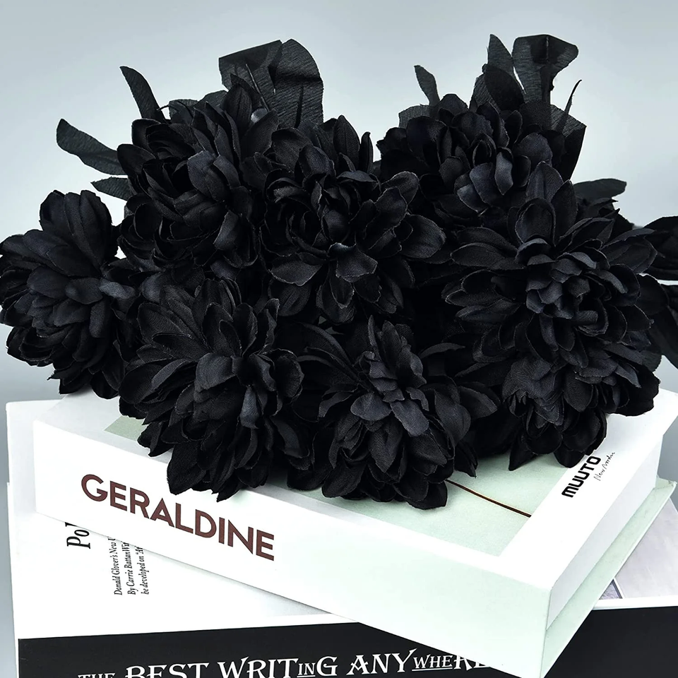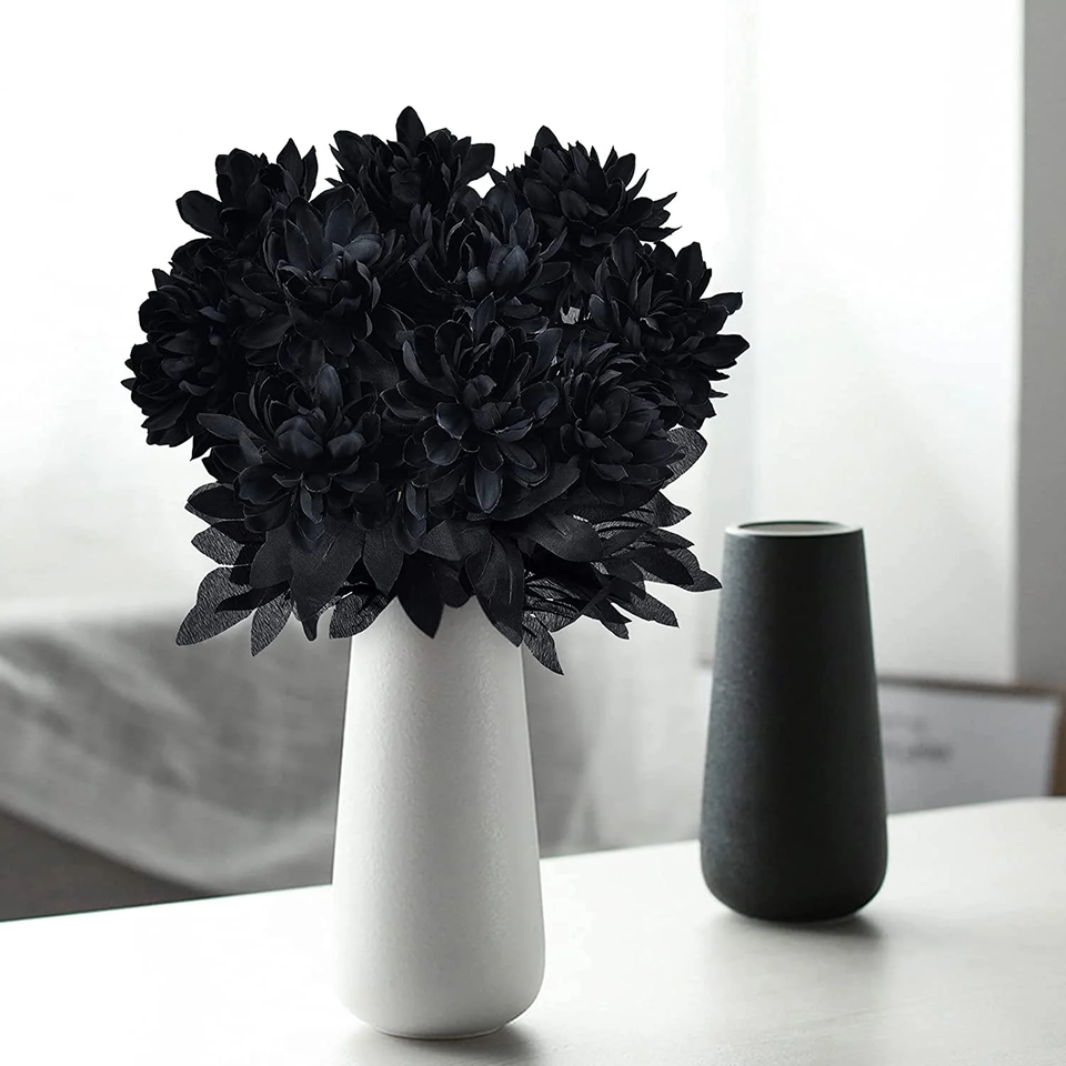 Do you want to decorate your room for Halloween? This black artificial dahlia bouquet will do the trick. Bouquets of faux silk dahlias are great gifts for Halloween, Valentine's Day, parties, holidays or anniversaries. Thanks to its natural and bright color, generous and elegant appearance, unique design and durable material, this silk dahlia will never be out of style. Our silk dahlias completely imitate the real effect, if you don't look carefully, you may think it's a real one. It's a wonderful flowers for halloween decorations indoor, halloween decor, halloween table decor, halloween decorations outdoor, halloween centerpieces for tables.