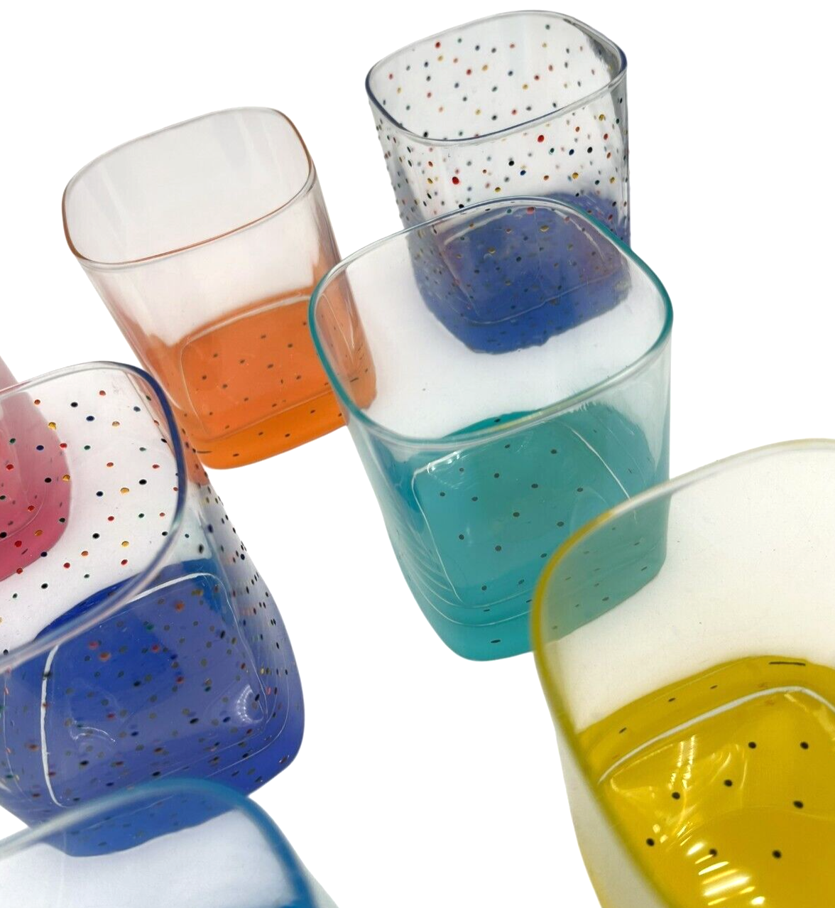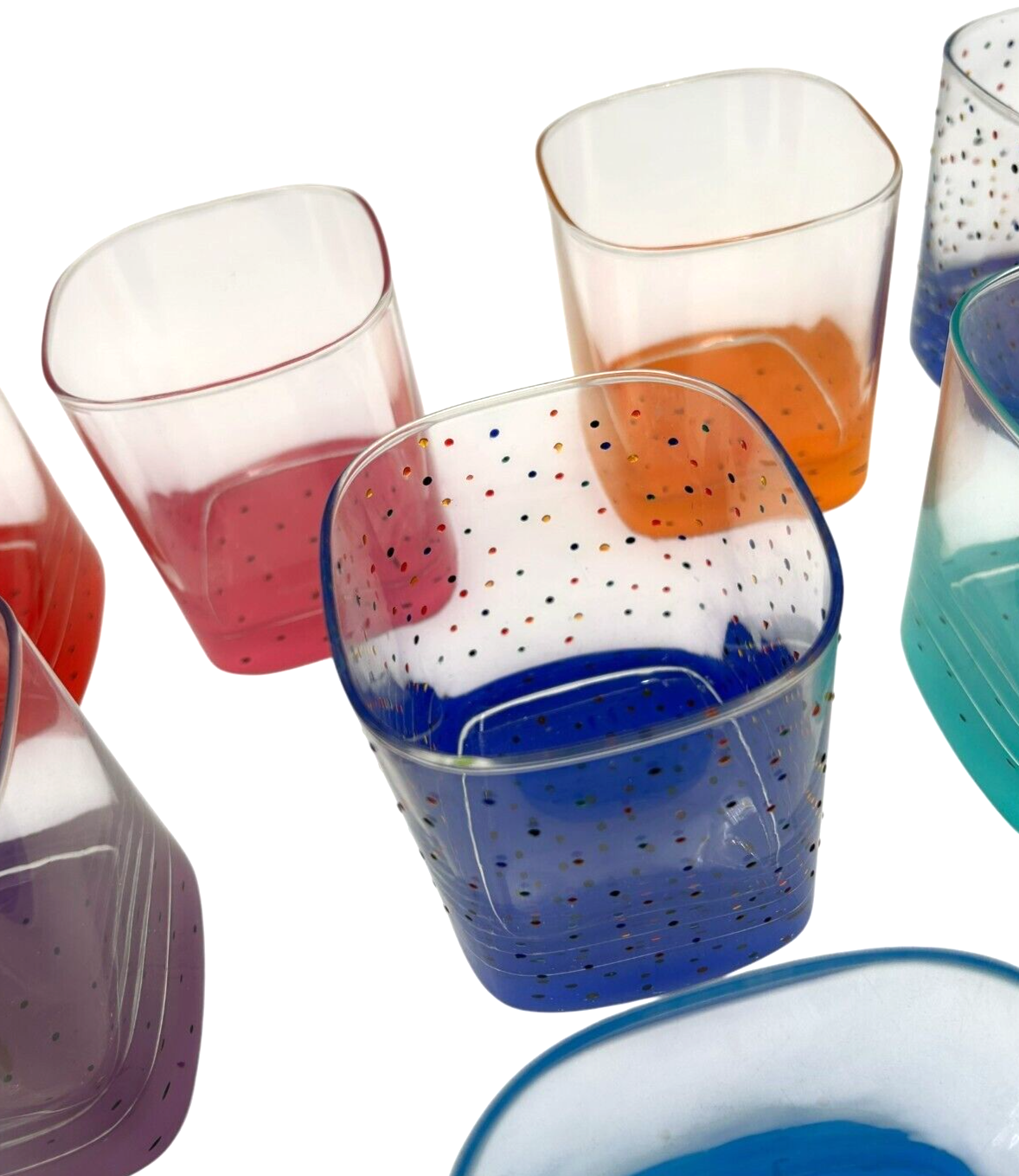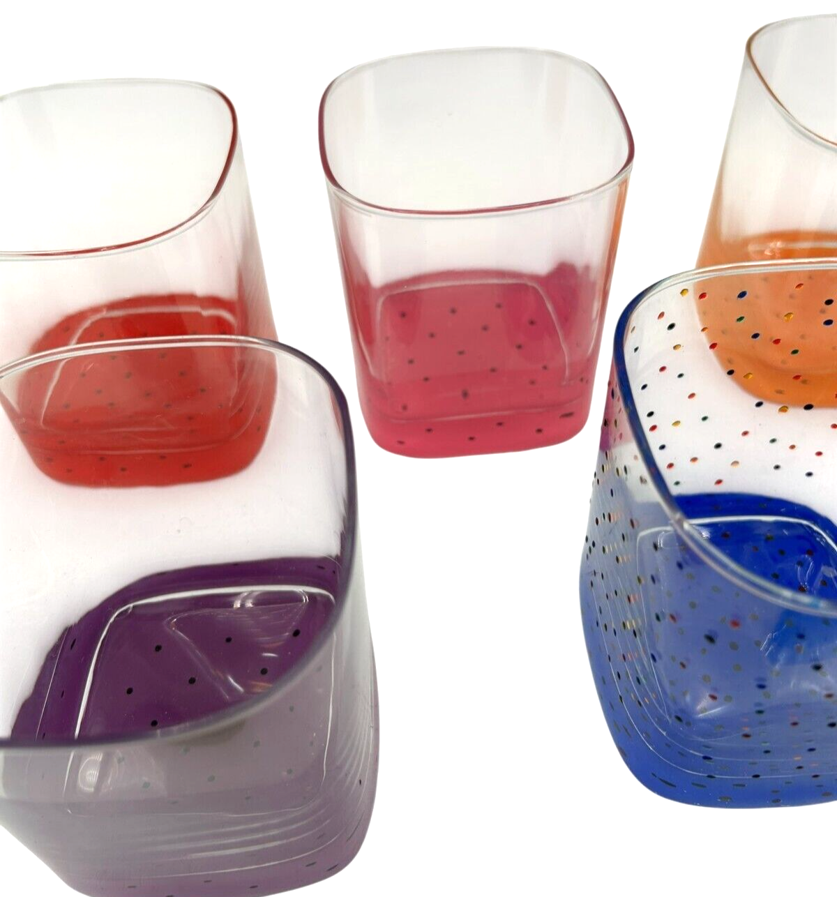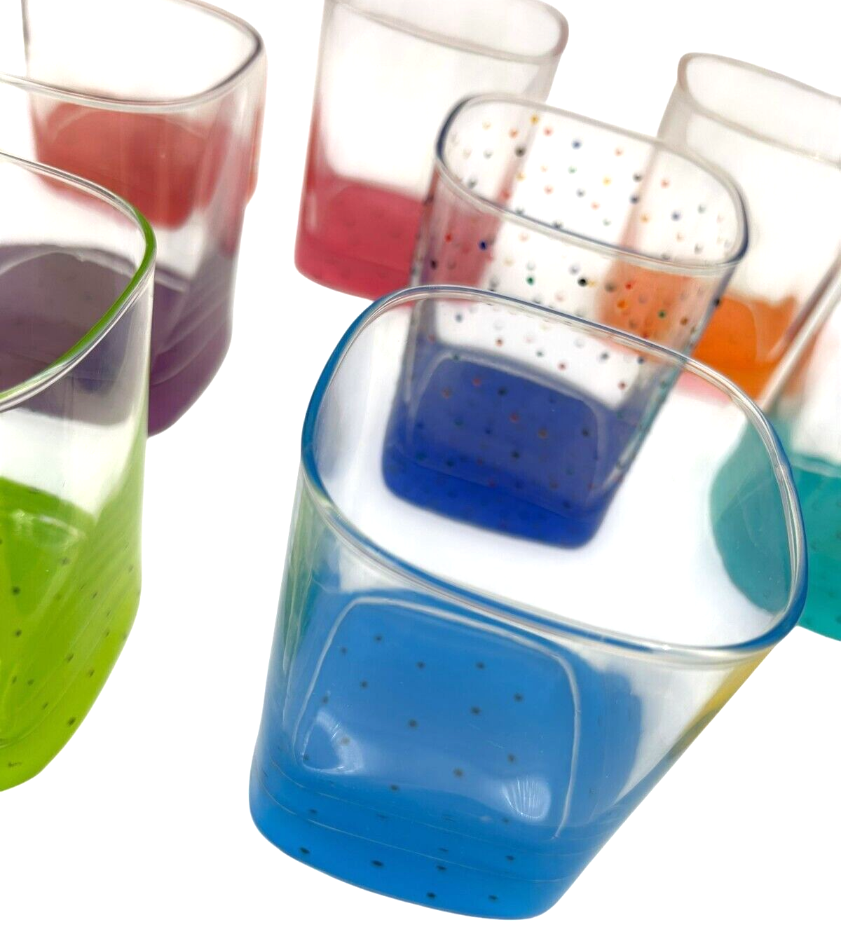 10 pc set - 3.5 x 3.25 square clear whiskey glasses with 9 different colored bases. 2 have dark blue base with raised multicolor dots on outside of tumbler, the rest are smooth on the outside with dots on bottom only.