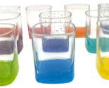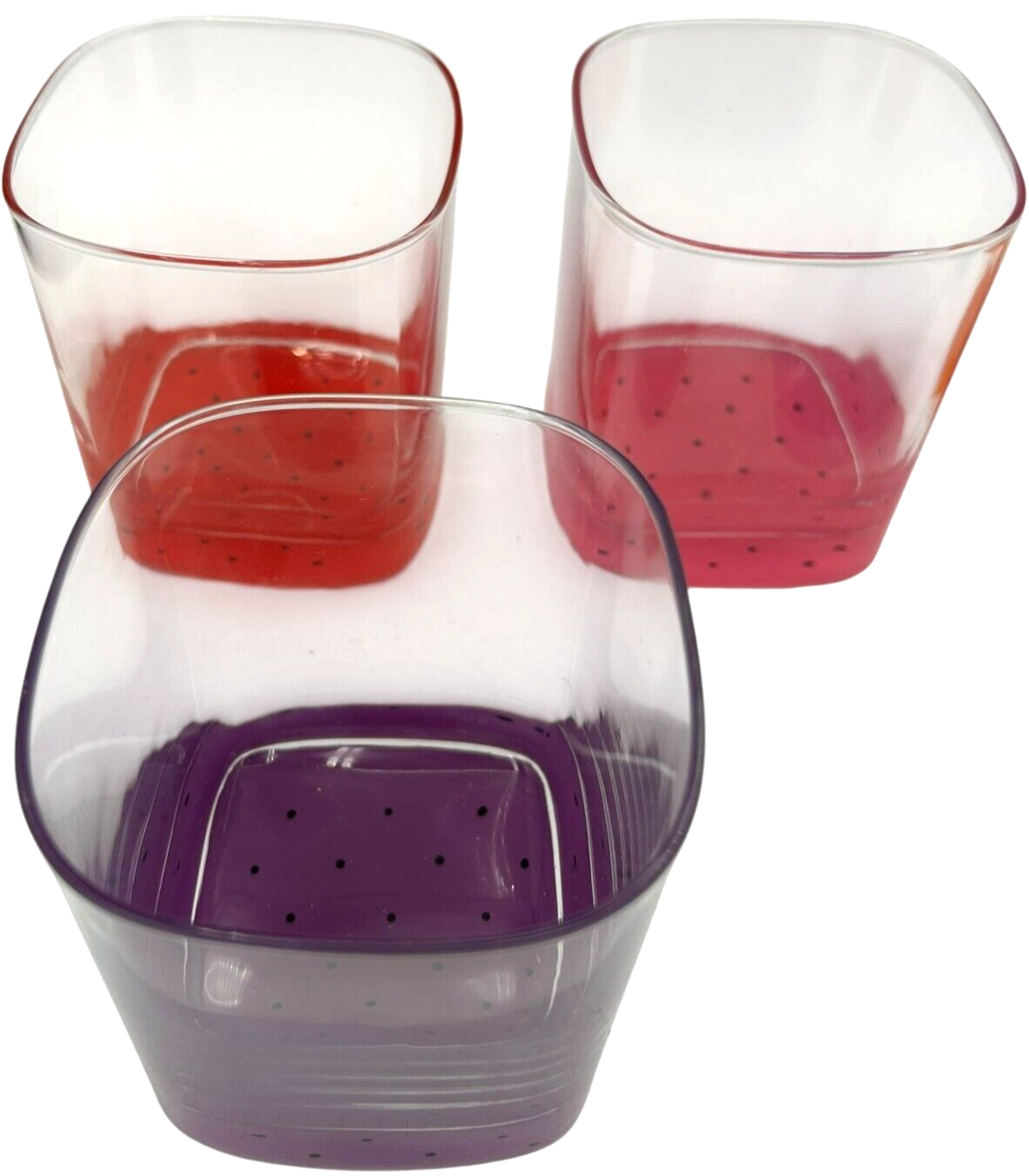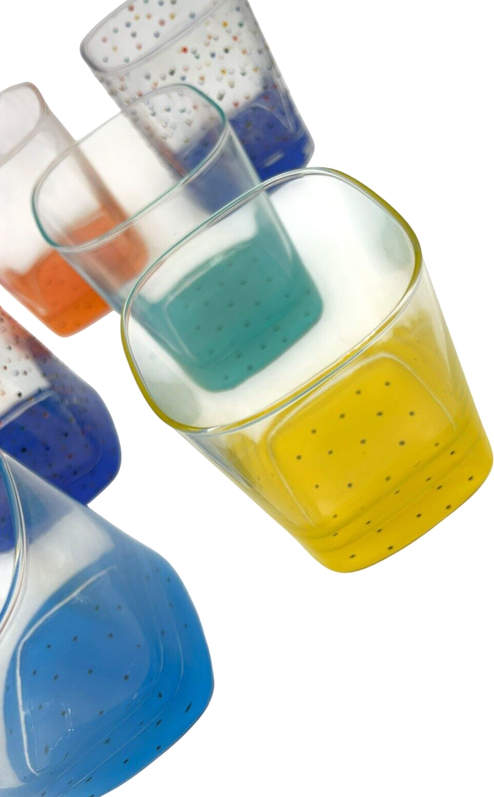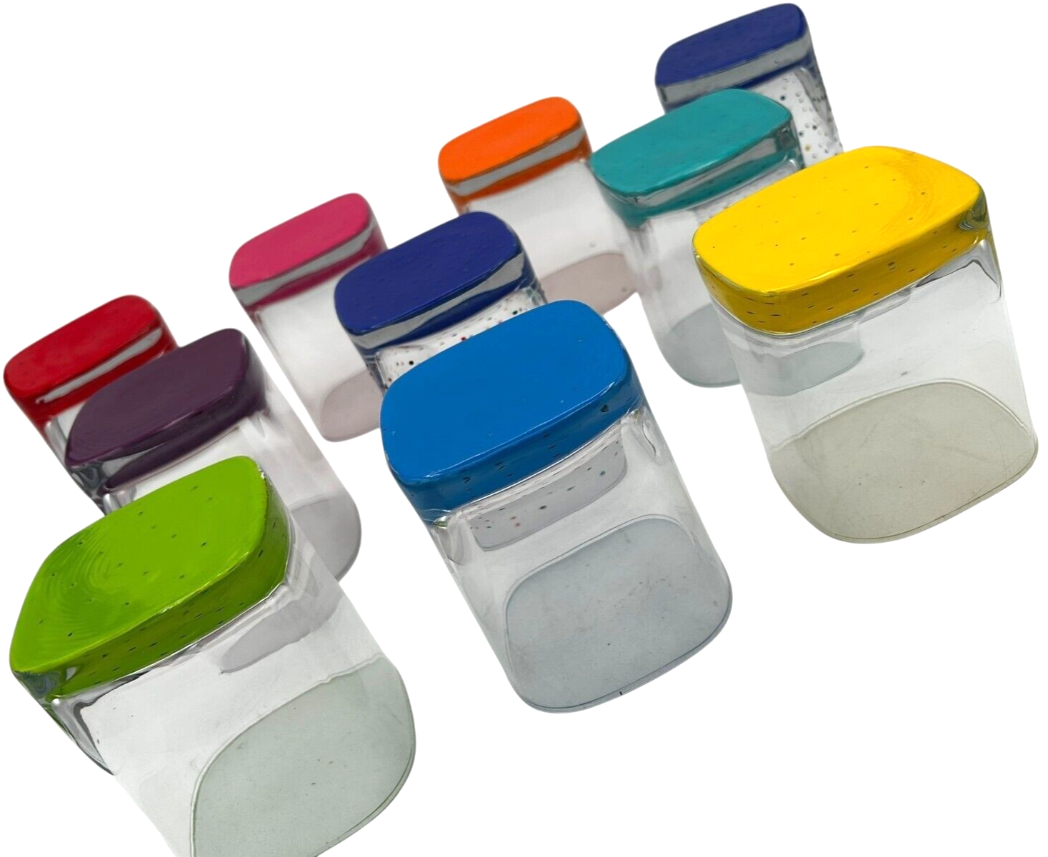10 pc set - 3.5 x 3.25 square clear whiskey glasses with 9 different colored bases. 2 have dark blue base with raised multicolor dots on outside of tumbler, the rest are smooth on the outside with dots on bottom only.