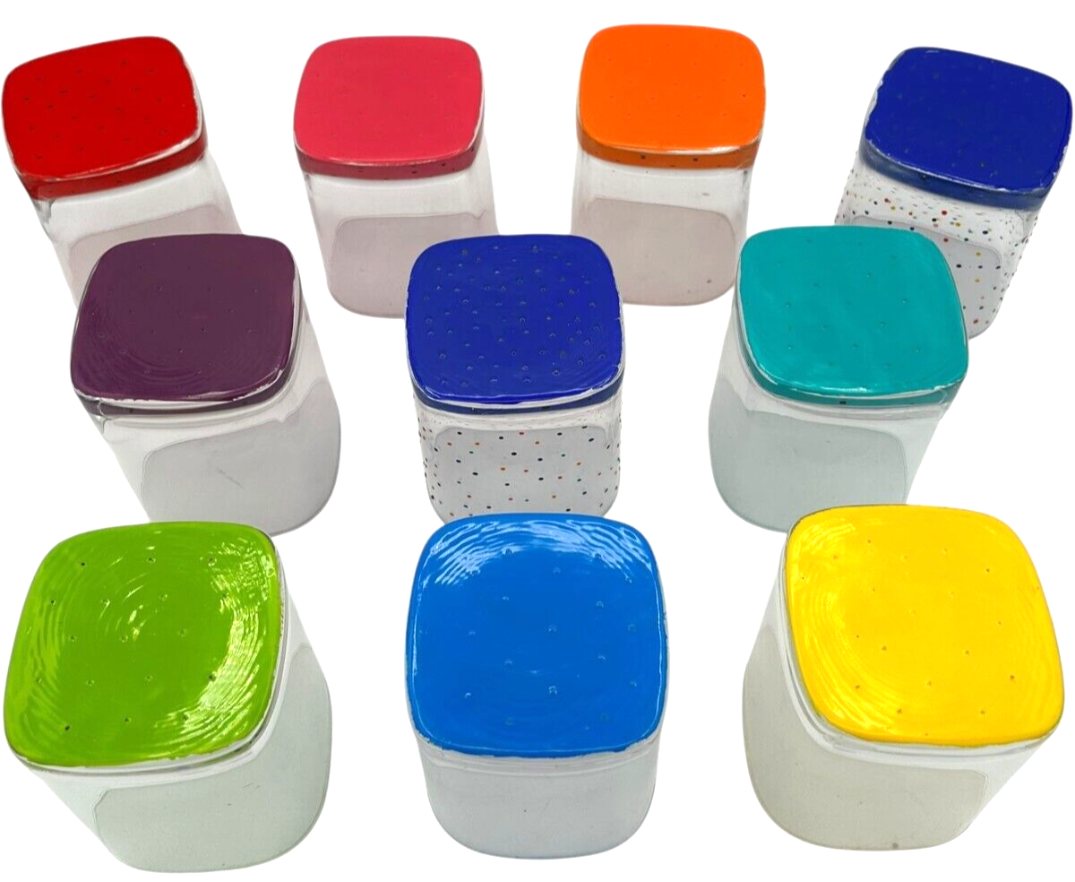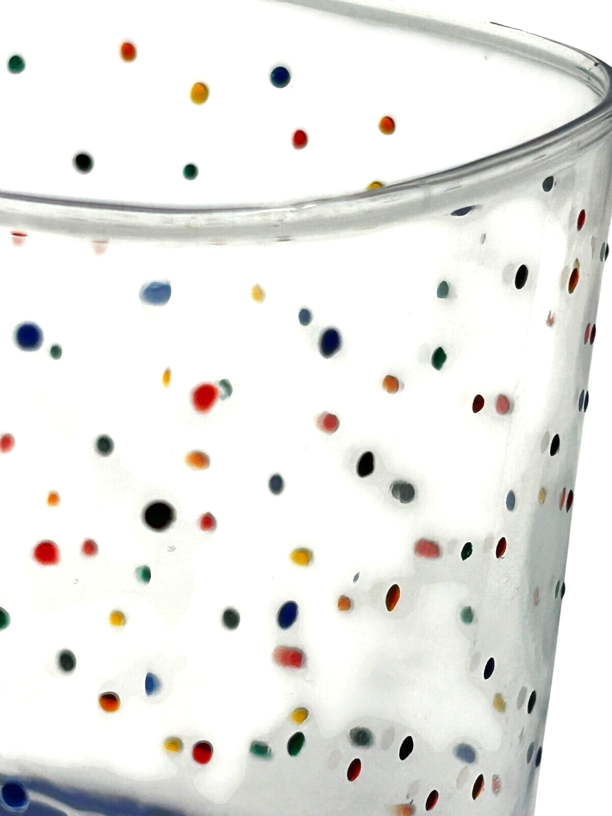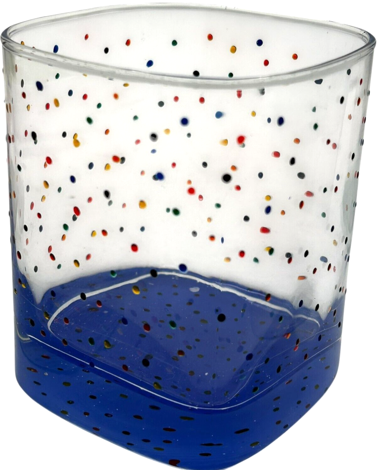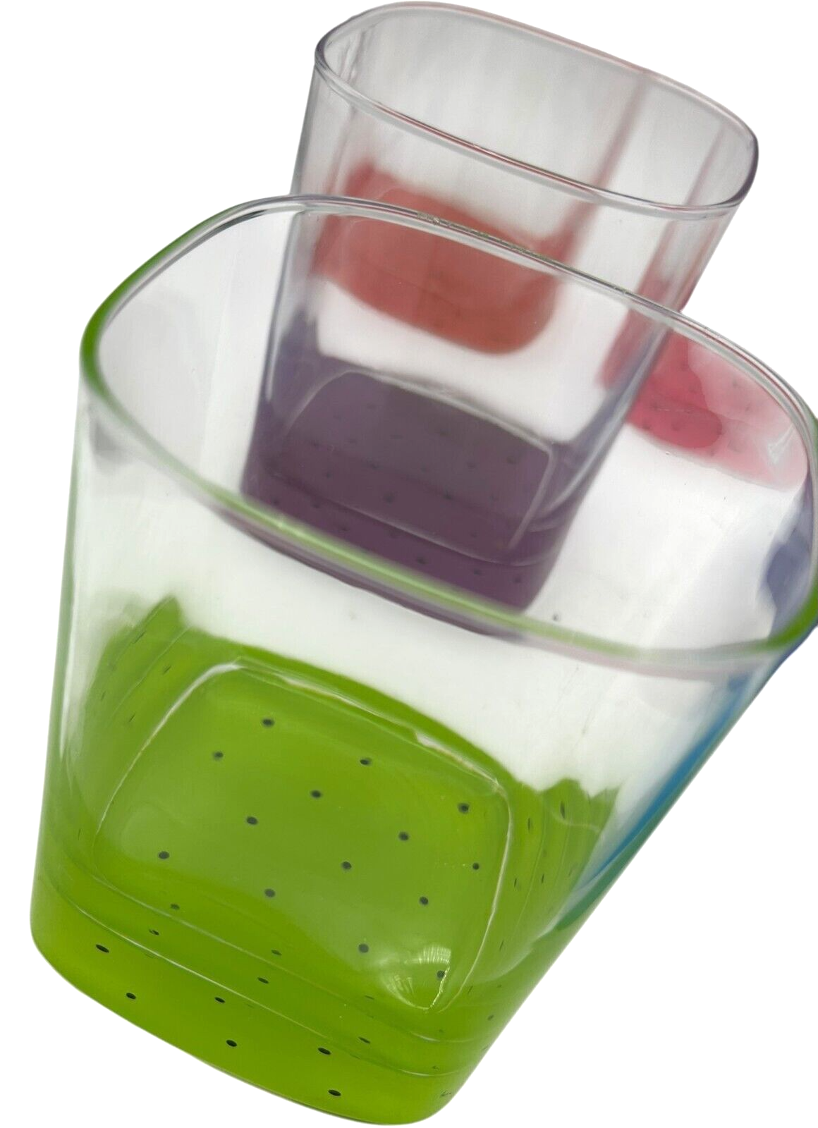 10 pc set - 3.5 x 3.25 square clear whiskey glasses with 9 different colored bases. 2 have dark blue base with raised multicolor dots on outside of tumbler, the rest are smooth on the outside with dots on bottom only.