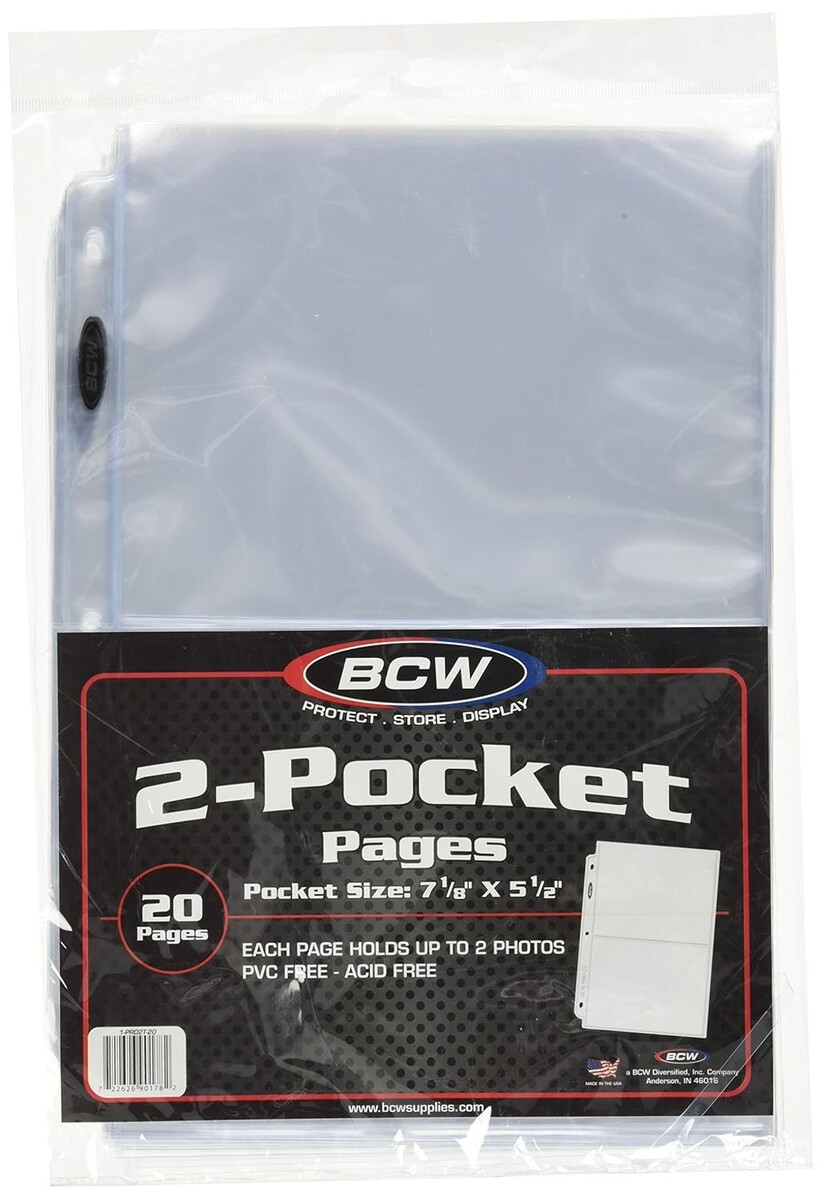 The BCW Pro 2-Pocket page is an acid free archival quality product that is perfect for storing 5x7 photographs or postcards. This product features high-clarity polypropylene and top loading pockets with strong welds. BCW Pro 2-Pocket pages fit all standard 3-ring binders and albums. Use the 2 pocket page to protect, store, and display your precious photos or postcards.