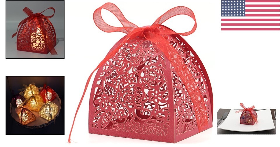 Crafted for both beauty and functionality, our Red Candy Boxes are the ideal choice for creating memorable moments. The luxurious pearlescent finish and unique laser cut design will charm your guests and add a stunning visual appeal to your event. With 100 boxes and ribbons included, you will have everything you need to make your packaging stand out.