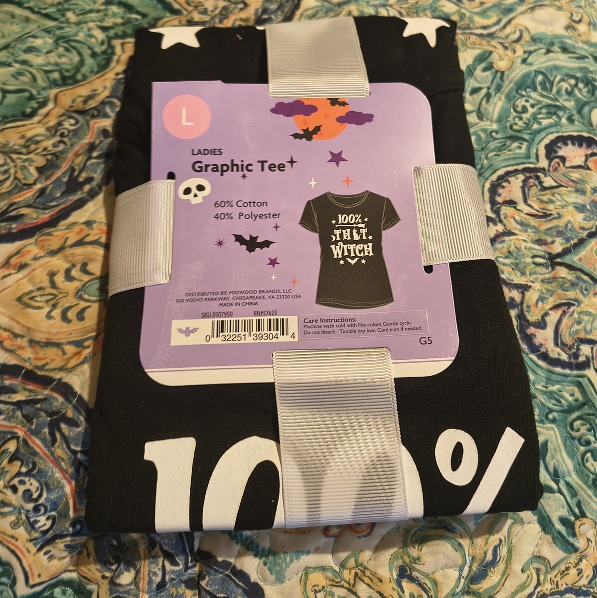 100% That Witch Women?s Halloween T-shirt Size Large Black White V-neck