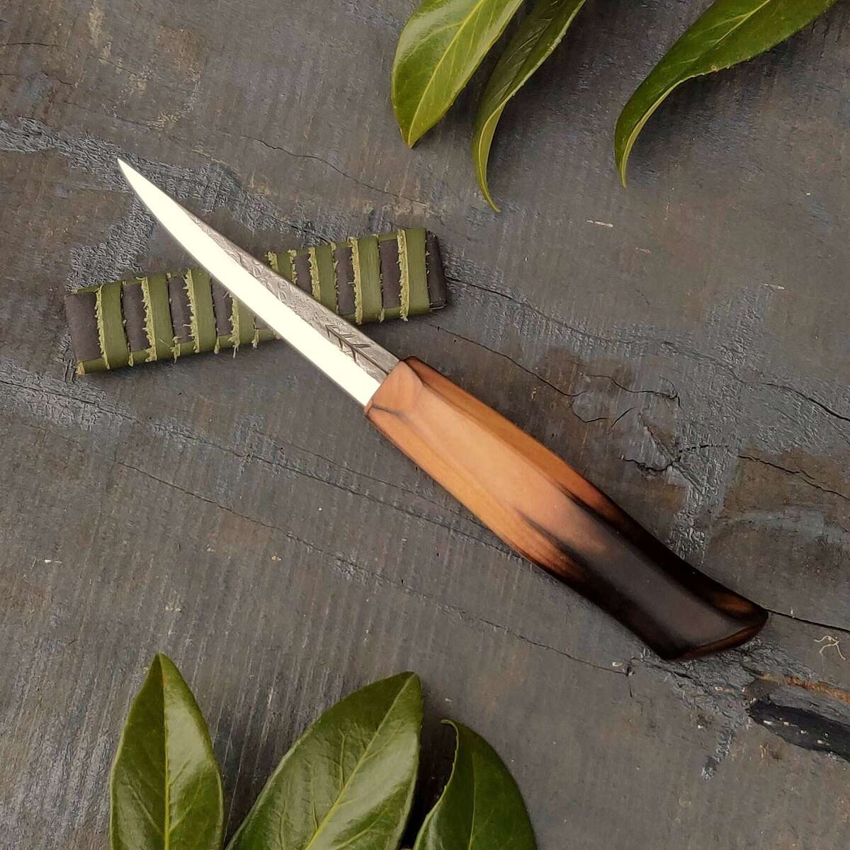 Carving knife made from hand-forged high carbon steel blade and roasted apple wood handle.