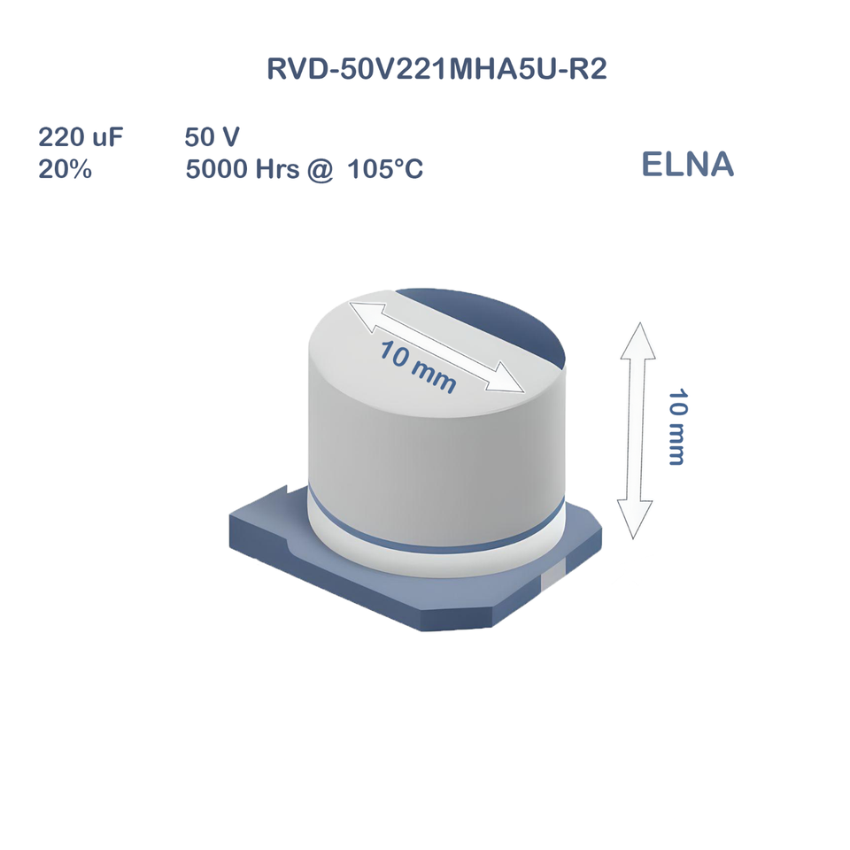 RVD-50V221MHA5U-R2 ELNA 220uF 50V 10x10 Aluminum Electrolytic Capacitor SMD 5000h 105C
