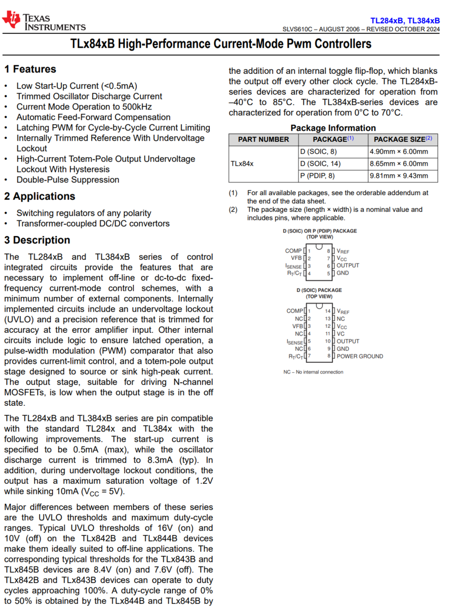 10 Pieces - TL3843BD-8 Texas Instruments High Performance Current Mode PWM Controller 30V 500kHz SOIC-8