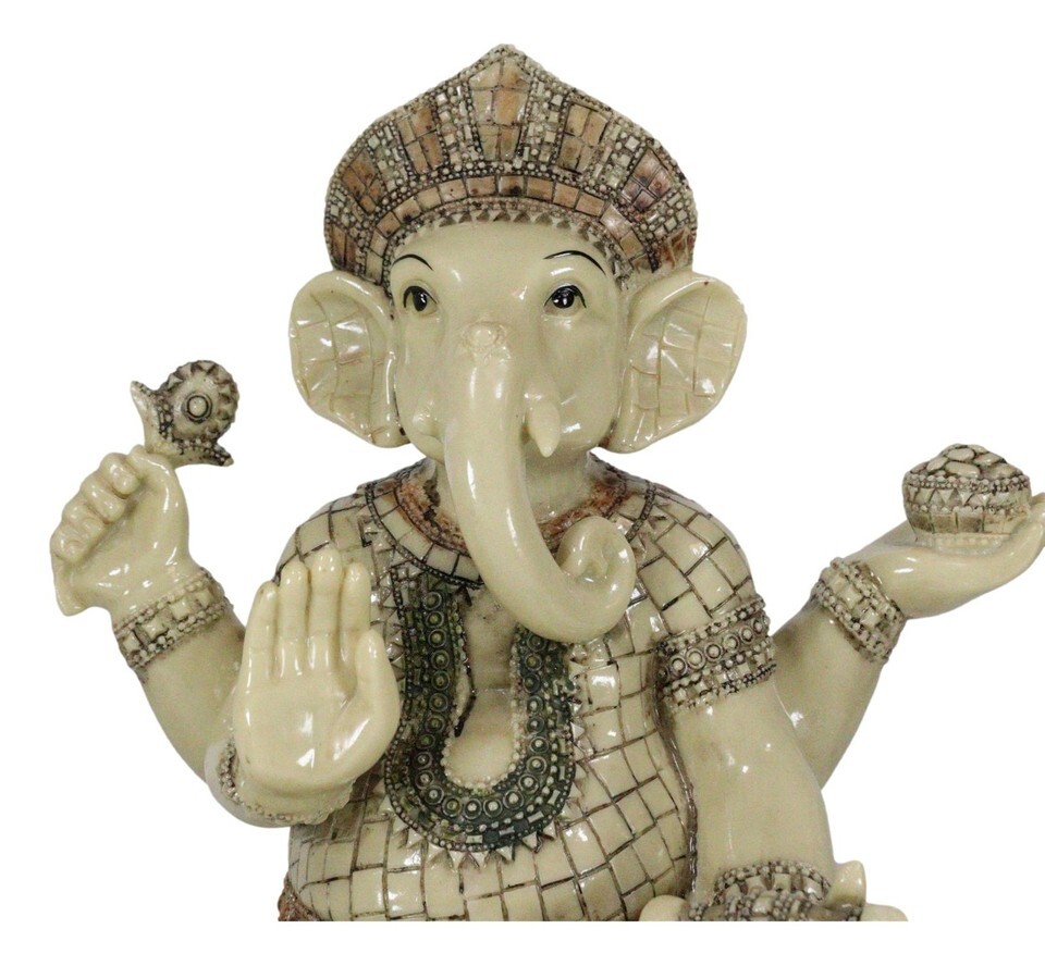 ? This Ganesha Sitting In Meditation Statue is made of designer composite polystone resin, hand painted and polished. Polystone which is composed of polyurethane, resin, and mixed with powdered stone additives that give it added weight and a porcelain or "stone-like" feel. Polystone is very durable and delivers a cleaner, more substantial representation of an original sculpture than other common materials.