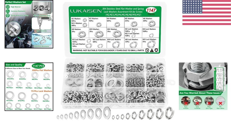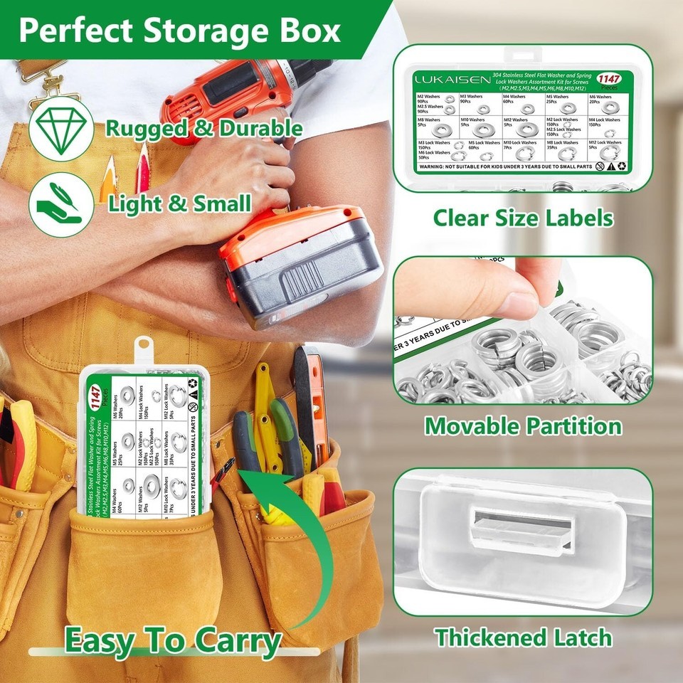 Easy Storage: Each set is conveniently packaged in a clear box with divided grids for seamless organization. Size labels on both the interior and exterior ensure you can easily find the right washer when you need it.