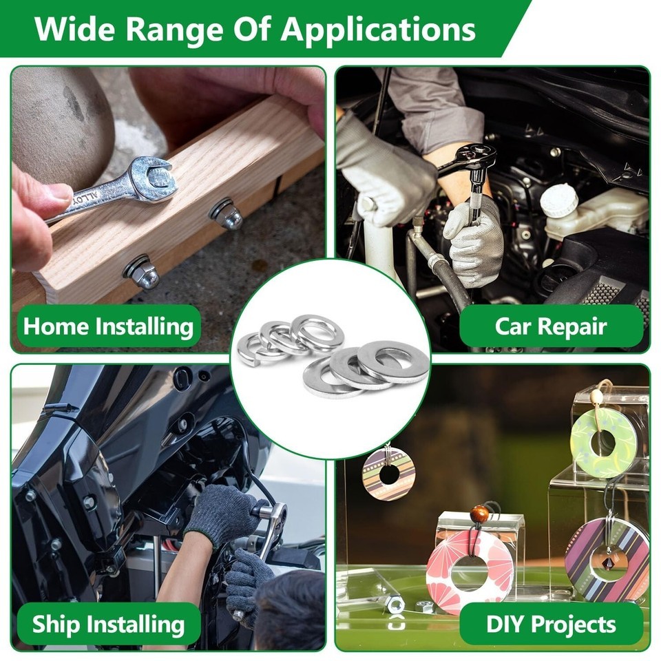 100% 304 Stainless Steel: Built to last, our lock washers and flat washers are crafted from high-quality 304 stainless steel, ensuring exceptional rust and corrosion resistance. Perfect for use in wet or harsh environments.