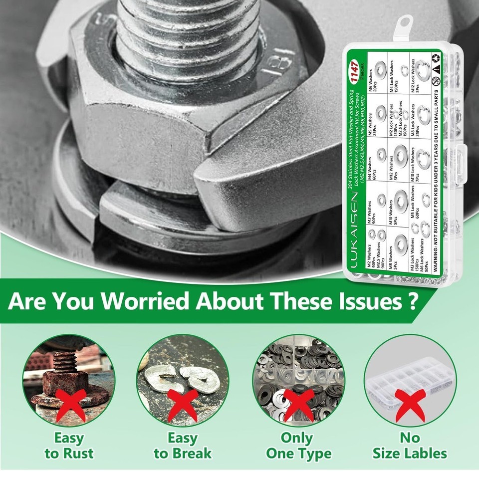 - 1147PCS Stainless Steel Lock Washer Set - Corrosion-Resistant Metric Assortment