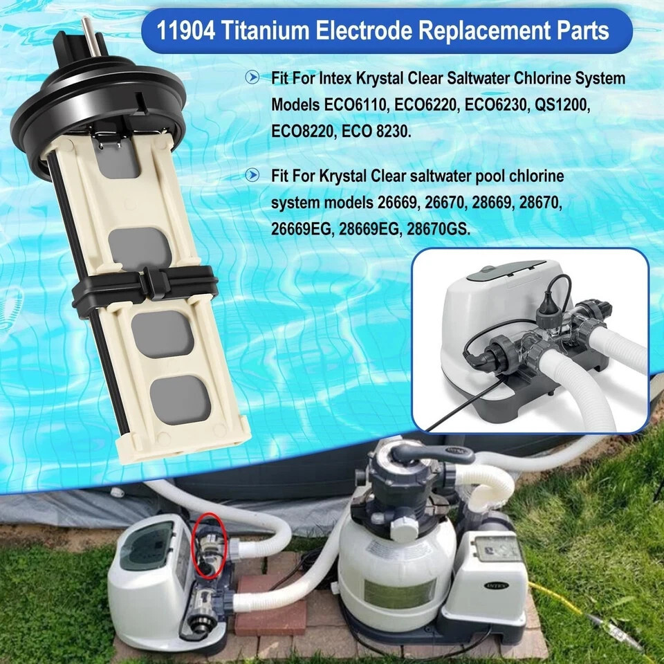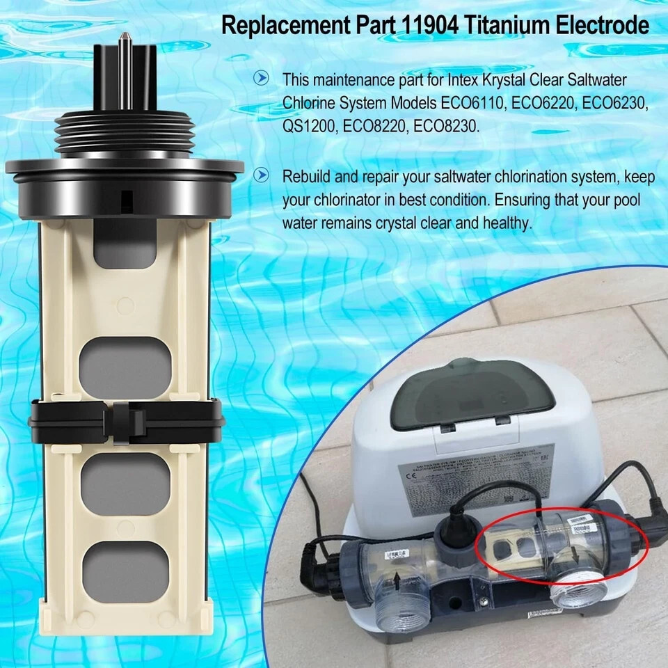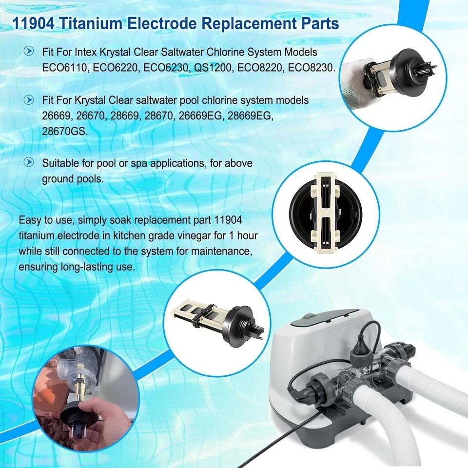 11904 Titanium Electrode Replacement Part Fit for Intex Krystal Clear Saltwater Chlorine Pump System 28669, 28670, 26669EG, 28669EG Chlorinator Wide Compatibility: The 11904 titanium electrode replacement part is compatible with Intex Krystal Clear Saltwater Systems including models 26670, 28670, 26669EG, 28669EG. Designed for above-ground pools and spas, ensuring seamless saltwater chlorination. Note: This part features 2 terminals for secure connection. Maintain Chlorine System Performance: Keep your saltwater pool chlorinator running efficiently! This titanium electrode replacement helps rebuild and maintain your saltwater chlorine generator, ensuring optimal performance and extended lifespan. Easy Maintenance: Simply soak replacement part 11904 titanium electrode in kitchen grade vinegar for 1 hour while still connected to the system for maintenance, ensuring long-lasting use. Durable Titanium Construction: Made with high-quality titanium for corrosion resistance, along with rugged plastic, rubber, and steel components. Professionally treated for enhanced durability in pool conditions. Easy Replacement: An essential saltwater chlorinator replacement part for Intex Krystal Clear Saltwater Chlorine System to keep your pool clean and safe. To make sure this is the correct part for your needs, Please refer to the photo to review the product dimension carefully before placing the order.