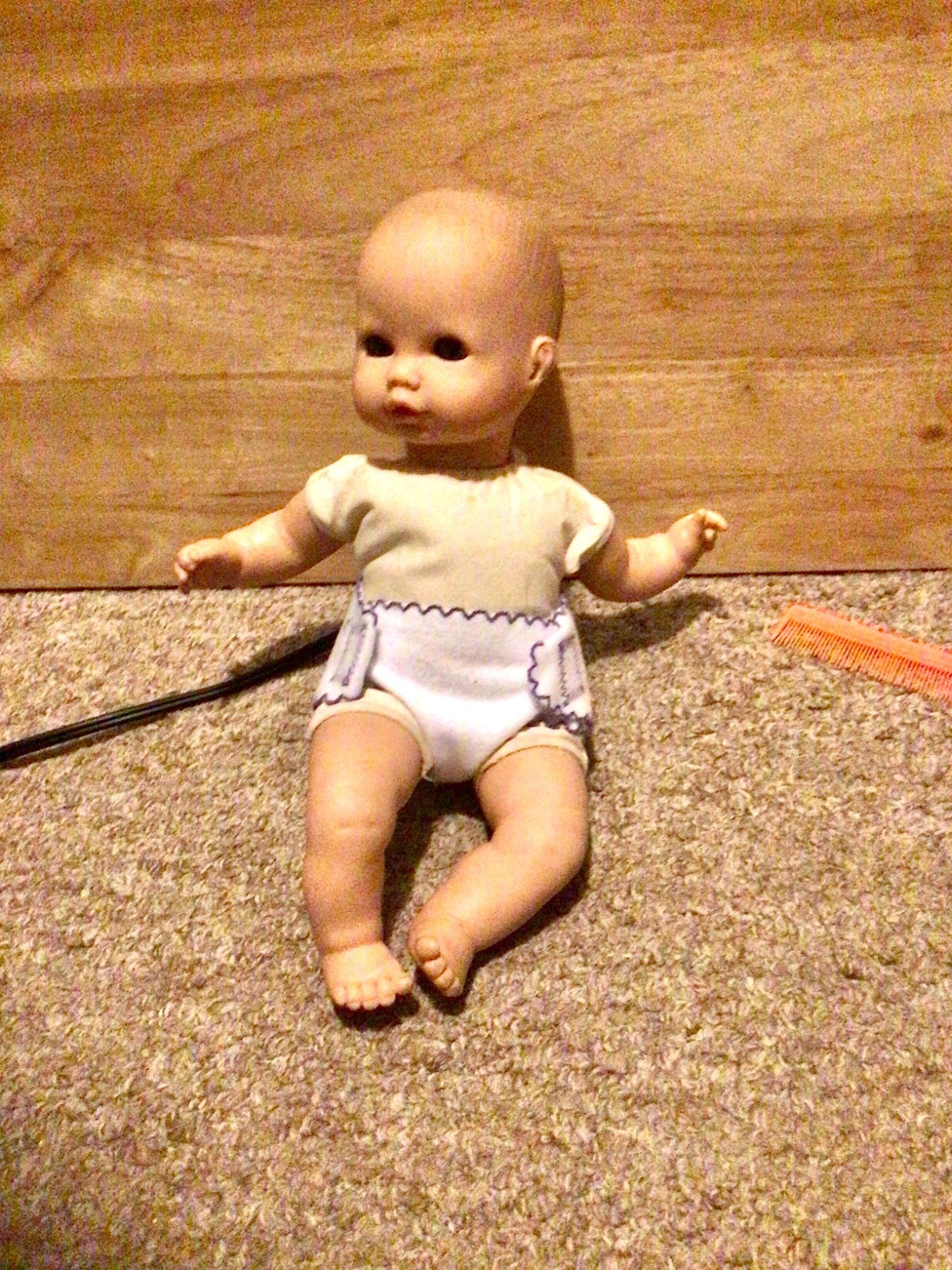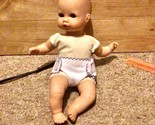 For sale is a 12" baby doll. It says "Gotz-Puppe" on the back of the neck with no other information. The body is cloth. The opening of the neck where it is attached to the body is tied with string and not attached with a zip tie. I think the legs are sewn on to the cloth body. The limbs are all vinyl. The body does have a few stains on it.