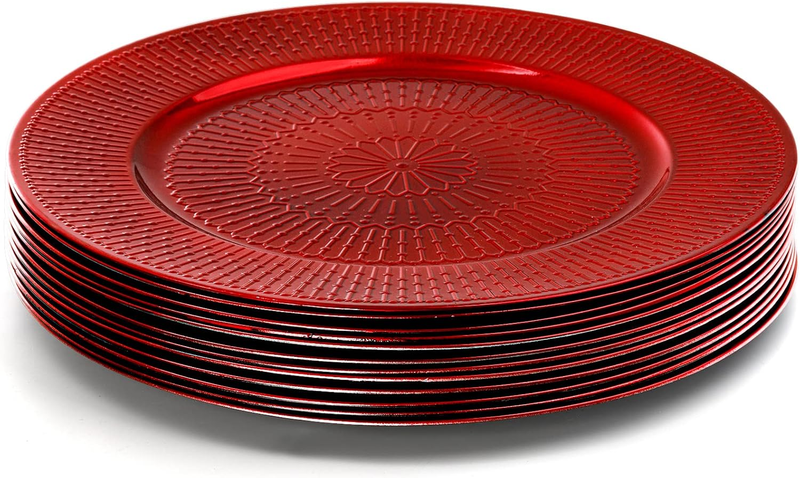 Coming with 12 packs of 13-inch round charger plates. Ideal size and wide rim to fit under salad or main course plates, soup bowls and prevent spills, while adding an exquisite touch. They are designed with elegant beads and flower patterns on the surface, combined with chic red color, which will create a brilliant effect and make them the charming accents for any table settings