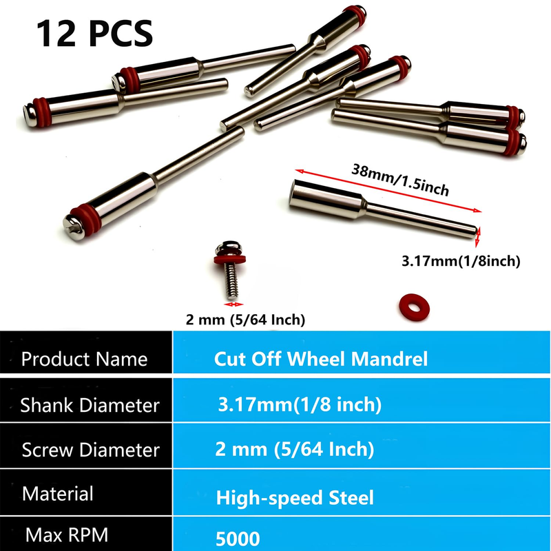 12PCS (Mandrel only. Cut-off wheel not included!).Shank diameter 3.15mm/ 1/8".Length: 38mm/ 1.5".Used to hold primarily sanding discs and cut-off wheels with 2mm to 3mm center hole.