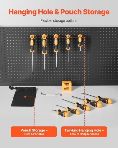 This screwdriver kit is made of CR-V6150 steel with electroplated bits for wear and corrosion resistance. Phillips and flat head bits provide a precise fit. Tips can be magnetized for screw retention. Features a non-slip handle, hanging hole, and storage pouch for daily and professional use.