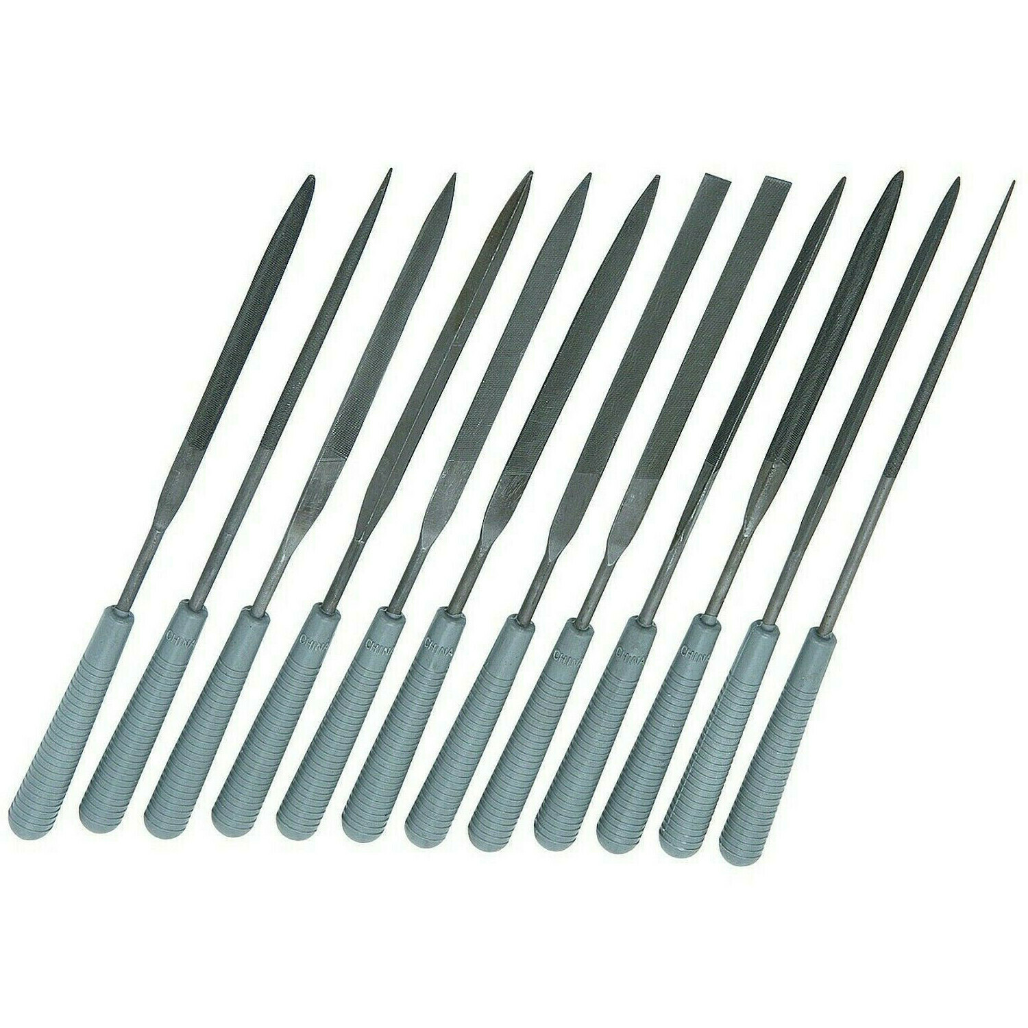 FOR SALE IS ONE (1) NEW 12 PIECE PRECISION NEEDLE FILE SET WITH POLY ABS HANDLES AND VINYL STORAGE POUCH. THIS SET OF 12 NEEDLE FILES FEATURES EASY TO GRIP POLY ABS PLASTIC HANDLES FOR BETTER CONTROL WHILE HANDLING DETAIL WORK. FEATURES A 6" total length INCLUDING HANDLE, WITH 2 1/2" length FILING SURFACE. A NEEDLE FILE IS DESIGNED FOR A RANGE OF FINE APPLICATIONS AND ALLOWS YOU TO EASILY FILE THOSE HARD TO REACH ANGLES or HARD TO REACH LOCATIONS. THIS FILE SET INCLUDES TWELVE (12) DIFFERENT FILES THAT ARE PERFECT FOR THE HOBBYIST OR ANYONE HANDLING DETAIL WORK IN THE SHOP OR GARAGE. 12 DIFFERENT FILE SHAPES INCLUDING BARRETTE, EQUALING, FLAT, MARKING, JOINT, KNIFE, HALF-ROUND, ROUND, SLITTING, SQUARE, 3-SQUARE AND CROSSING MAKE UP THIS 12 FILE SET. CARBON STEEL CONSTRUCTION WITH ABS HANDLES, 12 BRAND NEW NEEDLE FILES TOTAL IN THIS SET. YOU WILL RECEIVE ONE (1) 12 PIECE NEEDLE FILE SET IN VINYL STORAGE POUCH SHIPPED BY USPS.....