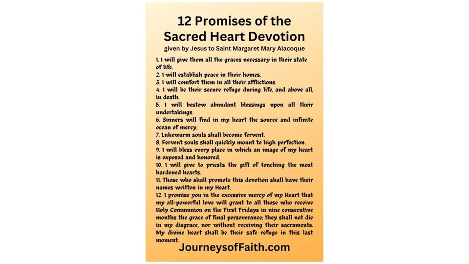 10 Pack - 12 Promises of the Sacred Heart of Jesus given to Saint Margaret Mary Alacoque by Jesus = Paray Le Monial France See Images Printed on Glossy Card Stock size is 3.5 inches by 5.5 inches 1. I will give them all the graces necessary in their state of life. 2. I will establish peace in their homes. 3. I will comfort them in all their afflictions. 4. I will be their secure refuge during life, and above all, in death. 5. I will bestow abundant blessings upon all their undertakings. 6. Sinners will find in my heart the source and infinite ocean of mercy. 7. Lukewarm souls shall become fervent. 8. Fervent souls shall quickly mount to high perfection. 9. I will bless every place in which an image of my heart is exposed and honored. 10. I will give to priests the gift of touching the most hardened hearts. 11. Those who shall promote this devotion shall have their names written in my Heart. 12. I promise you in the excessive mercy of my Heart that my all-powerful love will grant to all those who receive Holy Communion on the First Fridays in nine consecutive months the grace of final perseverance; they shall not die in my disgrace, nor without receiving their sacraments. My divine heart shall be their safe refuge in this last moment. Please visit our other listing to find more books and DVDs written by Bob and Penny Lord.