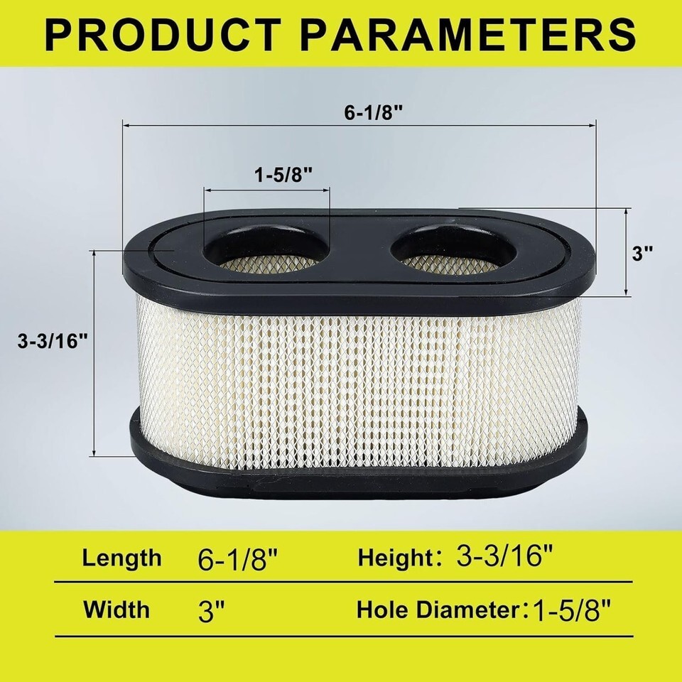 Air Filter Dimensions: Length: 6-1/8", Width: 3", Height: 3-3/16", Hole Diameter: 1-5/8" (measurements exclude the pre-filter).