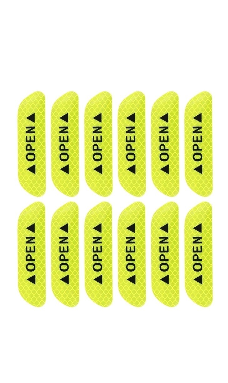 The product is a set of 12 yellow reflective tapes designed to be placed on car doors for added safety and visibility. These tapes are easy to install and can be placed on the left, front, or right side of the vehicle. The sticky adhesive on the back of the tapes ensures a secure and durable attachment to the car doors, providing a reflective light tape that improves visibility in low light conditions. This product offers a convenient and effective way to enhance the safety of car doors, especially in areas with limited visibility.