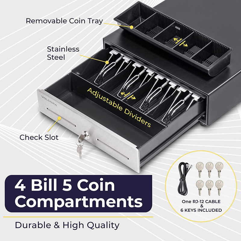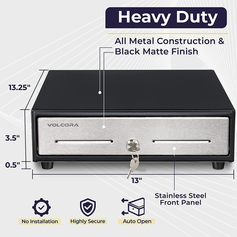 DURABLE AND GREAT LOOKING DESIGN - The 13.25" x 13" x 4'' dimensions of this cash register for small businesses is your perfect choice. Built out of heavy gauge metal steel, these cash registers will last through years. Volcora?s cashier register also boasts a unique color combination of black and stainless steel front.