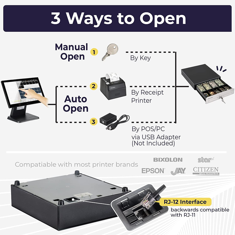 CONNECTIVITY AND COMPATIBILITY: Our small cash drawer suits the point of sale system for small business. Just connect the register drawer box to a receipt printer via the RJ11 / RJ12 cable included in the package, and then to your POS to automatically open or close cash trays. This locking cash box is compatible with most major receipt or thermal printer brands such as Star, Citizen, JAY, Star, and Bixolon. (No USB port, so CANNOT be connected to POS directly via USB)