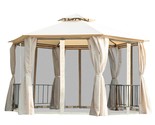 - 13'x13' Beige Hexagon Patio Gazebo Double Roof w/ Netting & Curtains