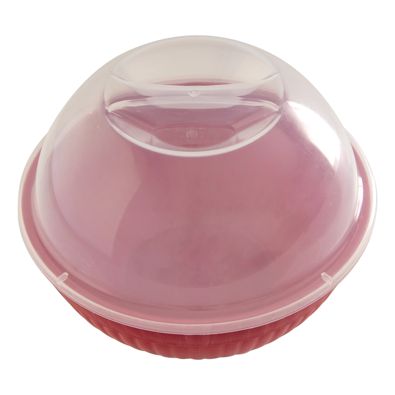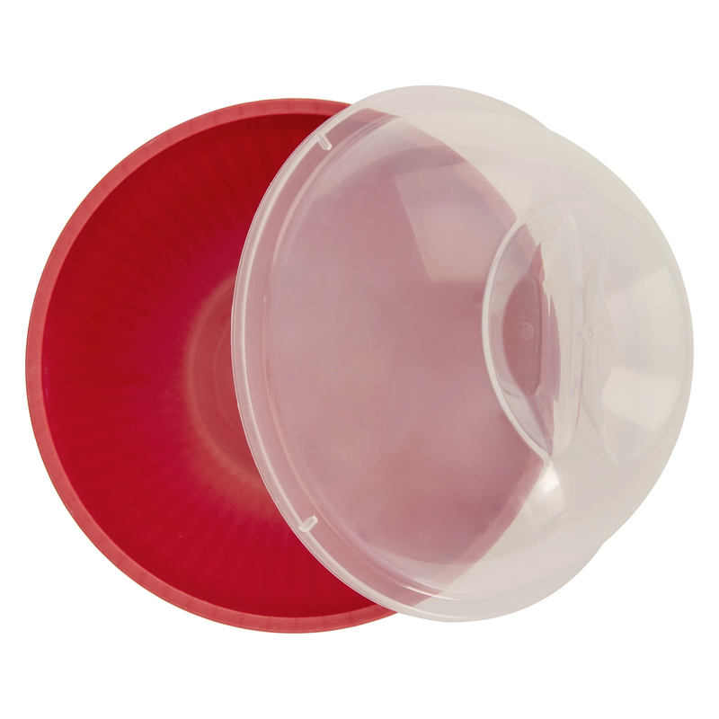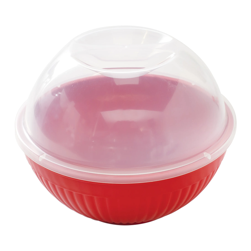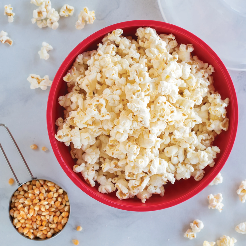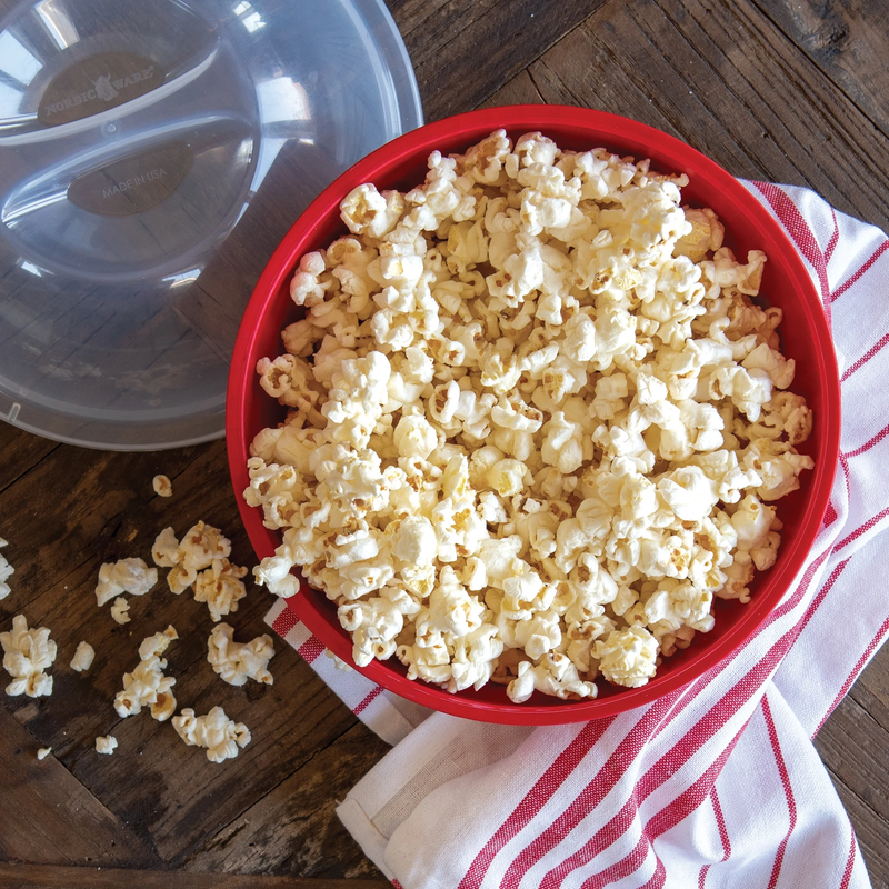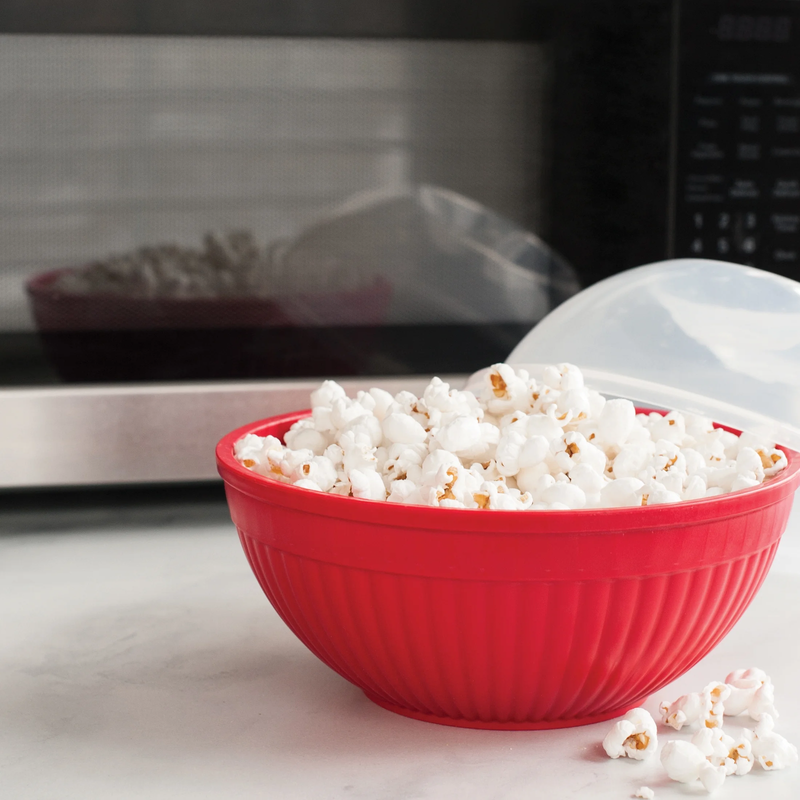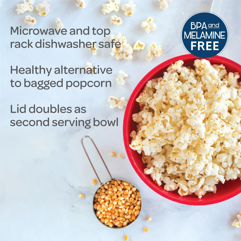 The Nordic Ware Quick pop bowl with lid in stylish red makes a single serving of microwave Air popped popcorn the quick and healthy way. An ideal snack solution healthier than pre-package popcorn bags, where you can select the seasoning and additives in the amounts to your taste. This microwave popcorn popper makes fluffy, air popped popcorn in minutes with no oil needed in your microwave. The 8 inch bowl makes up to 14 cups of popcorn at once to enjoy on your own or with others by using the dual-purpose lid as a second bowl for sharing. The lid and bowl can be placed on the top rack of the dishwasher for safe and easy cleanup.