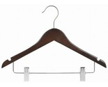 14" Walnut Wood combination hanger. Perfect size for junior's Teens. Space saving flat body with notches for hanging straps. Polished swivel chrome hook. With adjustable clips w/ Soft rubber cushions