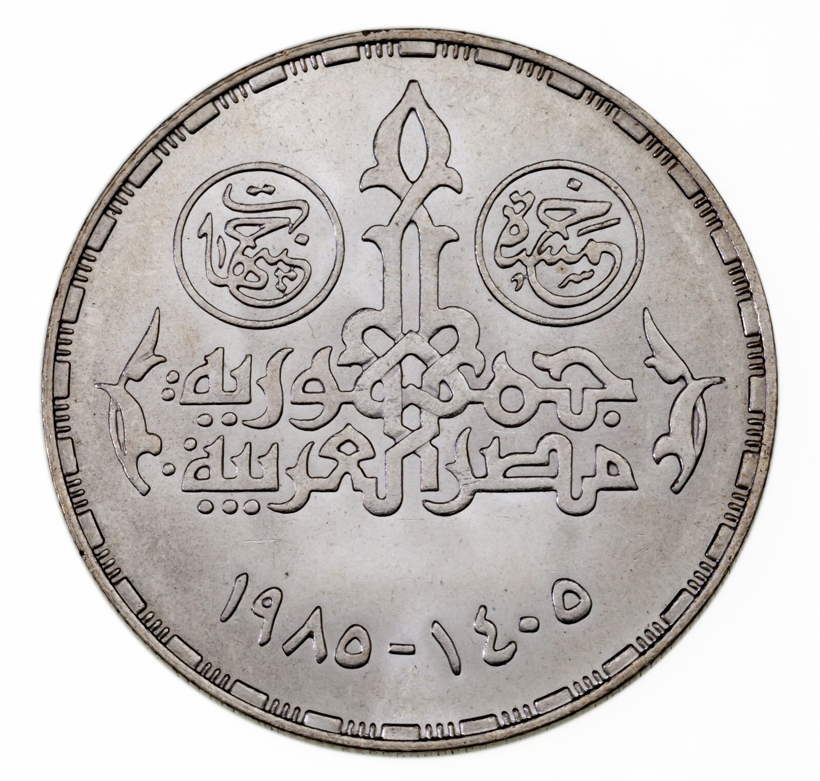 1405-1985 Egypt 5 Pounds Coin in BU, 100th Anni. Moharram Printing Press KM 563