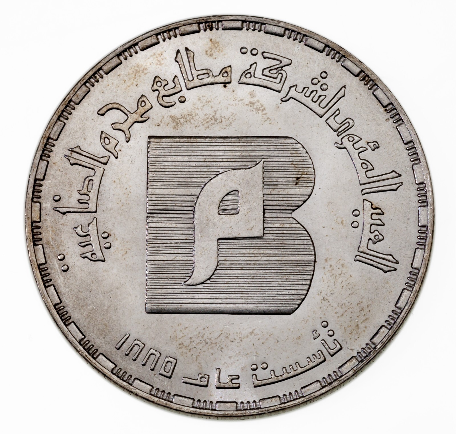 - 1405-1985 Egypt 5 Pounds Coin in BU, 100th Anni. Moharram Printing Press KM 563