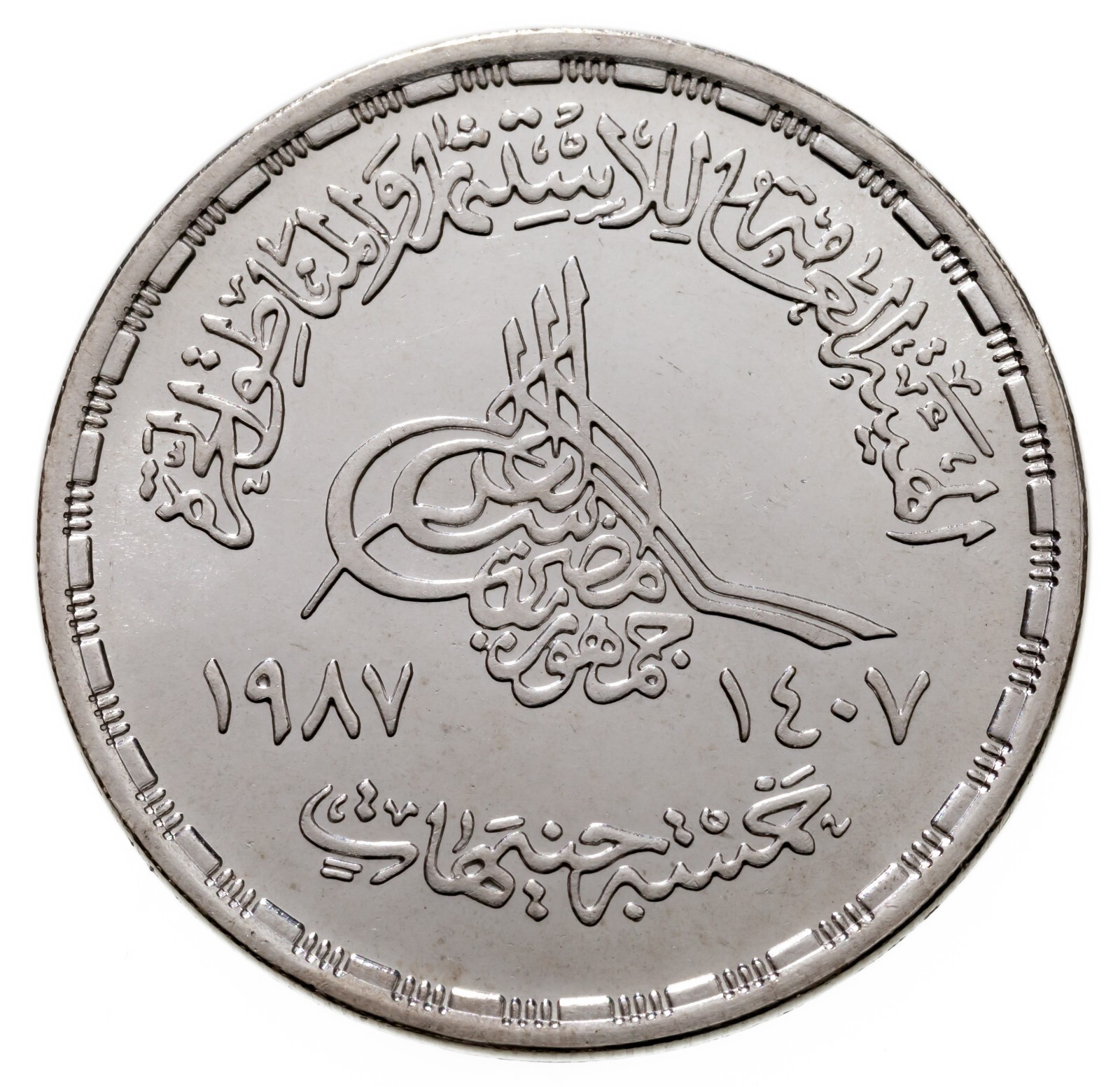- 1407-1987 Egypt 5 Pounds Silver Coin in BU, Investment Bank KM 651