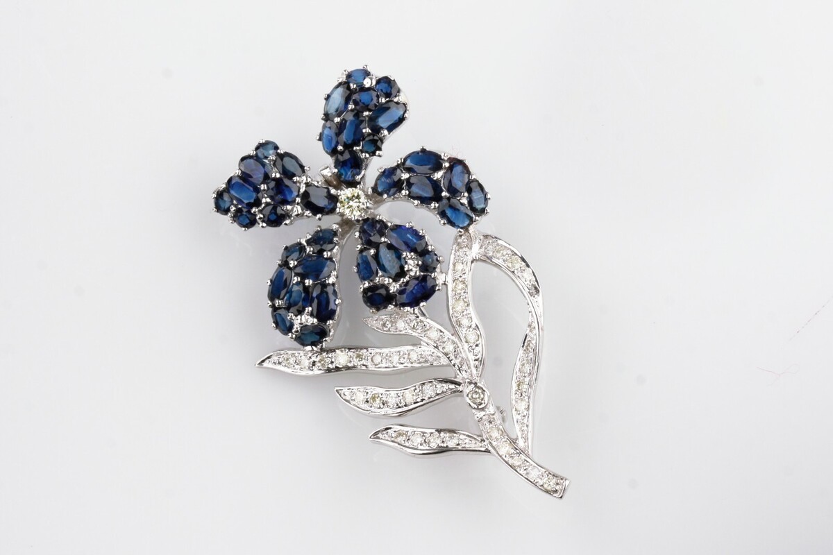 - 14K Weißgold Saphir Und Diamant Blumenbrosche TCW = 9,81 Karat