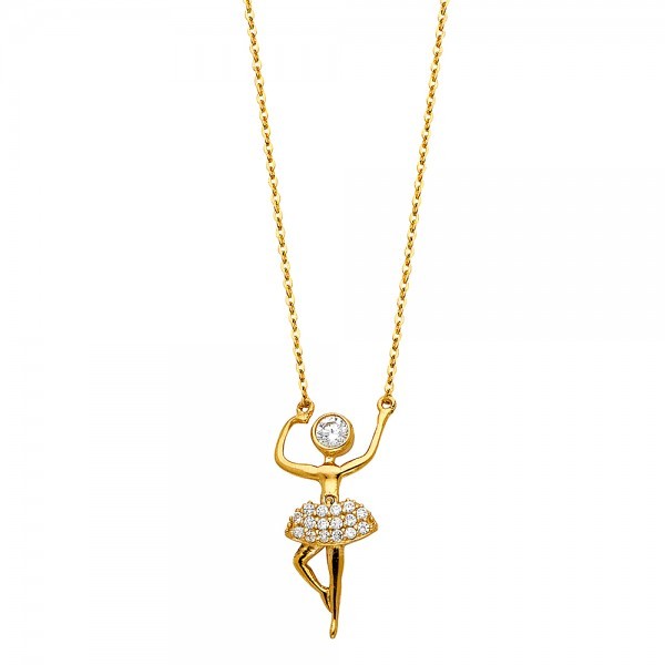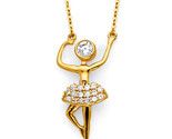 A pretty ballerina dangles from a 14K yellow gold rolo link chain in a floating pendant style. Round cut, high quality cubic zirconia stones decorate the pendant adding a spectacular sparkle to this adorable piece of gold jewelry.