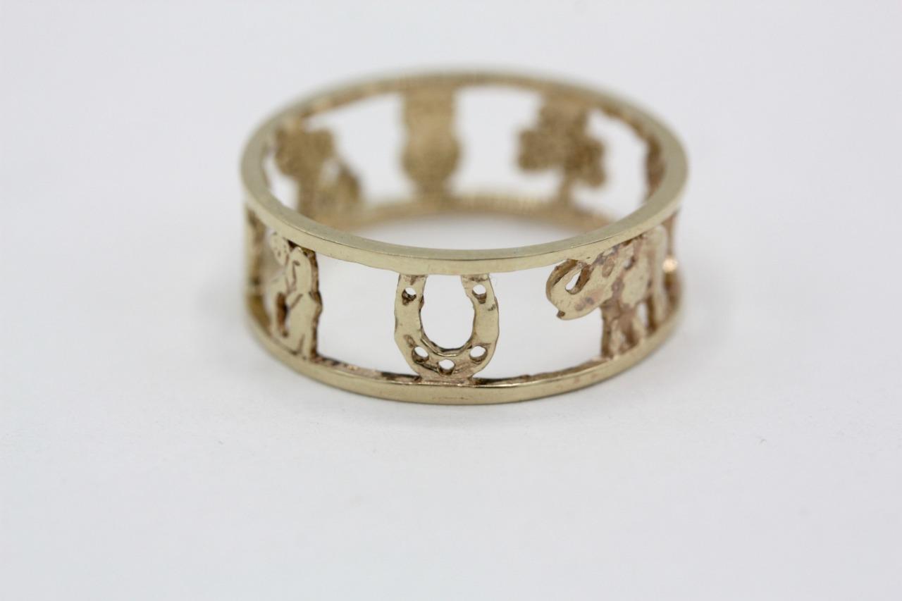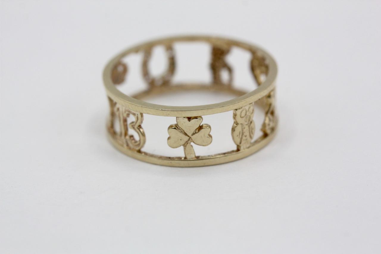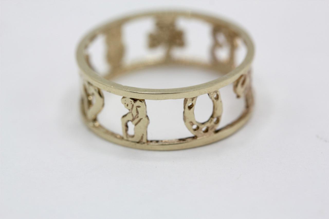 Fine 14K Yellow Gold Cut Out Design Lucky Symbols Band Ring Size 7.5 (2.4 grams)